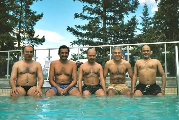 At a Spa near Banf. Recording the physical fitness of the gang at 50; July 2001. From left, Pradeep, Manga, Shashipal, Anil, Aku.