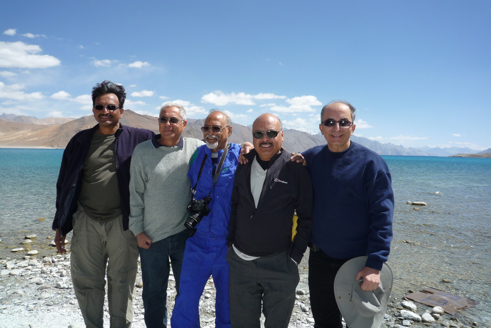The Gang at Pangong Lake, at an altitude of 14,270 ft is one of the highest lakes in the world. It is a long thin lake, 83x3miles, and partly lies in China. Although it is a saltwater lake, it freezes over in the winter. The Bollywood movie "3 Idiots" was partly filmed here.