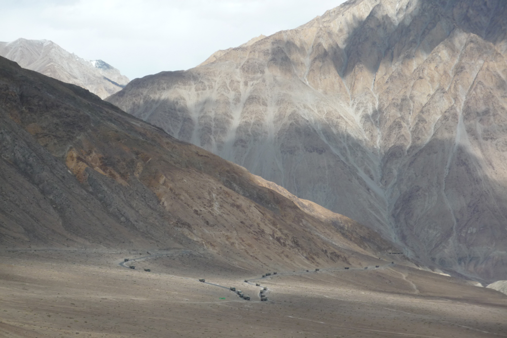 Convoy of Indian military trucks in the mountain. Getting stuck behind a convoy when uphill is bad as the convoy crawls while billowing out massive amounts of diesel exhaust. Best to wait for half an hour at the base and let the convoy get away.