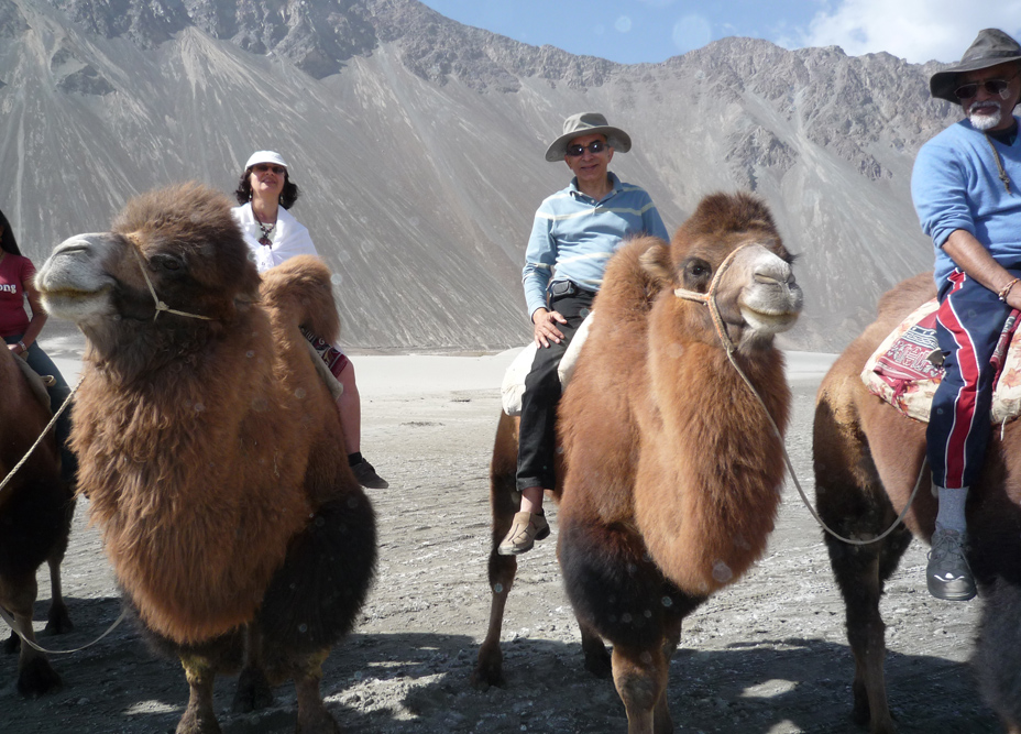 Enjoying camel rides in the Desert .. Bactrian camels with two humps.