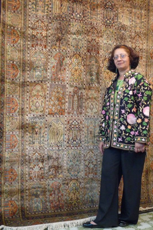 Neerja next to a stunningly beautiful silk carpet. It cost a fortune, but we will go back to buy it one day.