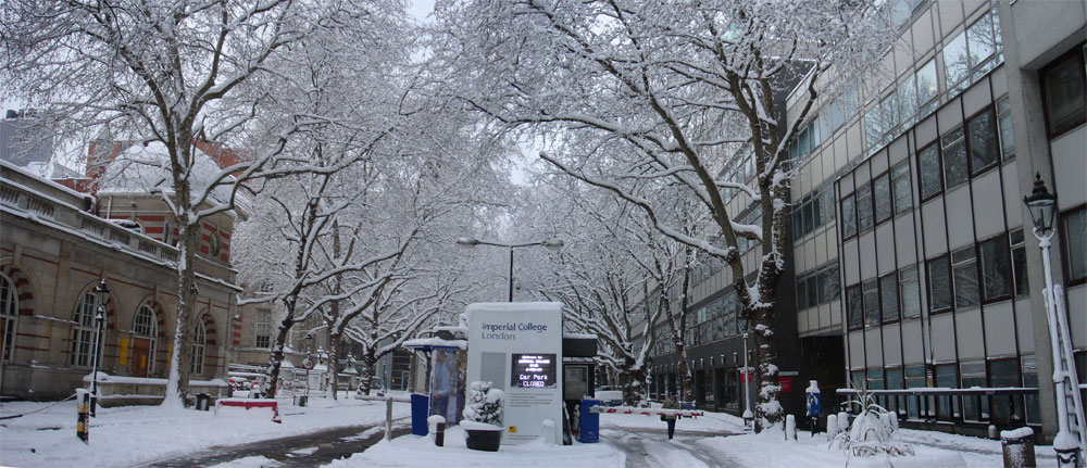 Main Gate at South Kensington campus during a rare snow storm, February 2009
