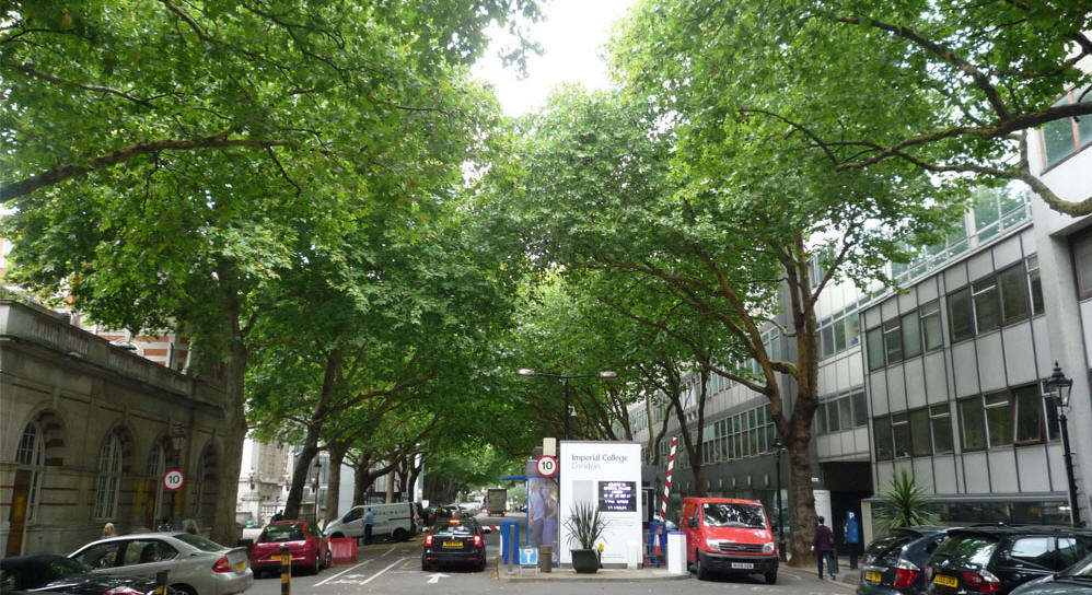 Main Gate at South Kensington Campus in summer, Aug 2011. This is Imperial College Road, an avenue lined with majestic plane trees.