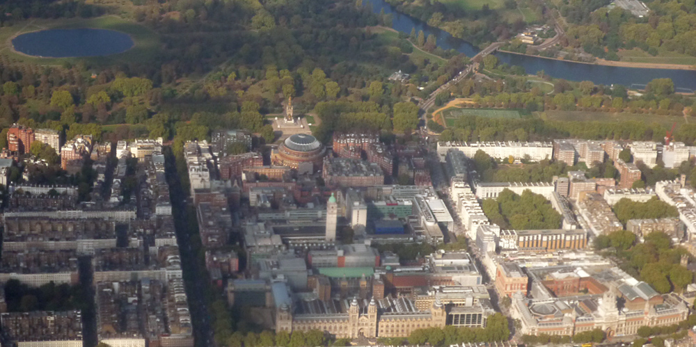 Imperial College London and surrounds on 12 October 2011 photographed during descent into Heathrow. In the middle of the picture is Queens Tower with its green dome, landmark of Imperial. In the foregound at centre is the Natural History Museum and at the right is Victoria & Albert Museum. Almost exactly in the middle is the Royal Albert Hall. The greenery at the background are the famous parks of London, Hyde Park with the Serpentine lake at the right, and Kensington Gardens with Round Pond at the left. |