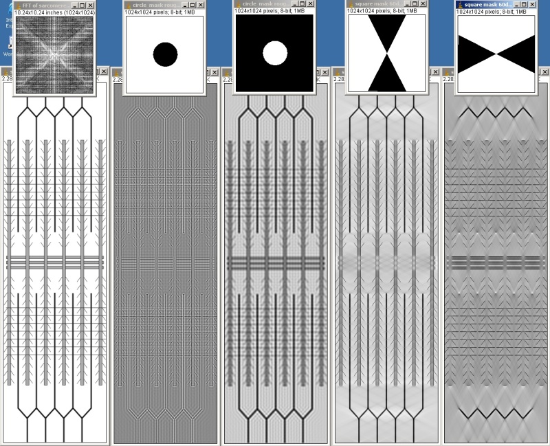 (b) High-pass filtered resulting from the Fourier transform filtered with the mask above. (c) Low-pass filtered. This results in blurring fine detail. (d) Wedge-filtered, illustrating the case in the electron microscope with the tilt axis along the sarcomere axis. Filaments are clearly resolved but perpendicular elements (M-line) are suppressed. (e) Wedge-filtered, tilt axis now perpendicular to the sarcomere axis. Now all filaments are suppressed but M-line is clearly resolved. For this example, dual-axis tilt-series as commonly used in electron tomography is homologous to combining both the wedge-filters, hence the original image would be obtained. |
