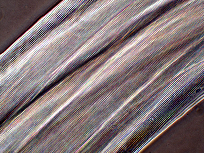 A bundle of striated muscle fibres as seen in a light microscope. The spacing of the striations is about 2.2 µm. Below is the same picture coloured differently.