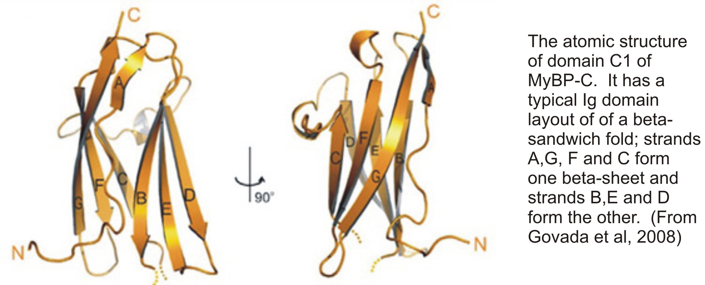 MyBP-C can be likened to beads on a necklace; the beads are 10 kD, ~100 amino acid domains of the immunoglobulin (Ig) and fibronectin (FN3) family. The domain structure of the cardiac and skeletal forms are identical; however the cardiac isoform has additional important properties: it has an additional Ig domain C0 at the N-terminus and has 4 phophorylation sites in the MyBP-C mofit (also called M-domain). There are nearly 200 mutations (missense and point) in cMyBP-C and they occur over the whole molecule. The other proteins in muscle with similar structure are titin and myomesin. Titin is a giant 3 MDa protein which spans half sarcomeres from the M-band to the Z-disc. Myomesin is an important crosslinking protein in the M-band. Understanding the properties of the Ig and FN3 domain is of fundamental importance. The atomic structure of the Ig domain was first solved for telokin, which forms the C-terminal domain myosin light chain kinase. Lata Govada et al have solved the atomic structure for domain C1 and Mark Pfuhl and colleagues have solved the NMR structure of domains C0, C1, C2 and C5.