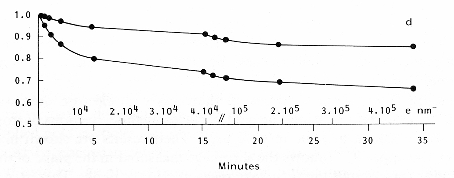 The plots show that typically the section shrinks laterally to about 95% and collapses to 75% of its starting values after 5 min (an accumulated dose of 1300 e-/nm2). The collapse is most rapid in the first 3 min and thereafter the section stabilises with only a little further collapse and lateral shrinkage. After 15 minutes, the dose rate was increased nearly 9 fold to 380 e-/nm2/s. This caused a new collapse curve taking the lateral shrinkage to 90% and collapse to 70% before again stabilising. Since the curves level off after each set dose rate, this indicates that the changes that occur in a sample allow it to dissipate the energy at the set dose rate. This implies that the lower the beam intensity used to collect a tilt-series, the smaller is the total shrinkage of the sample. For this reason, it is necessary to preirradiate a section in order to induce shrinkage beyond the rapid phase. In the levelled off region, using low-dose electron microscopy, several electron micrographs can be recorded for a complete tilt series with little further change in dimensions.